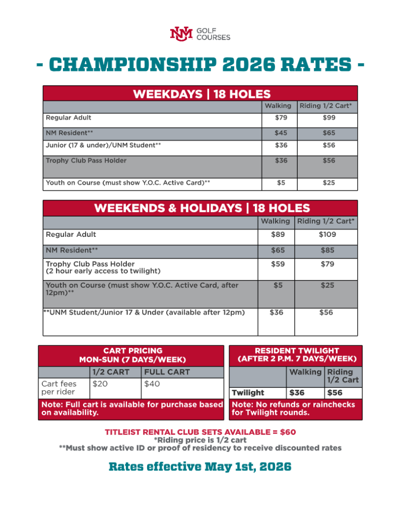 A vaild applicable ID must be shown to receive any discounts at The UNM Golf Courses